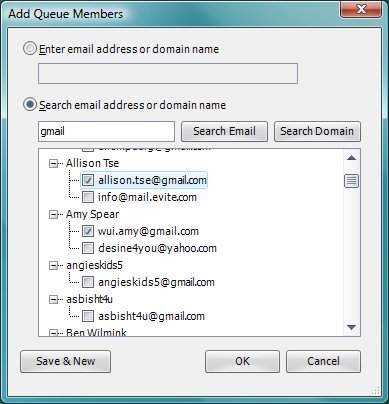 To add members in the queue, enter or search for email address or domain name, select the name then click the OK button.