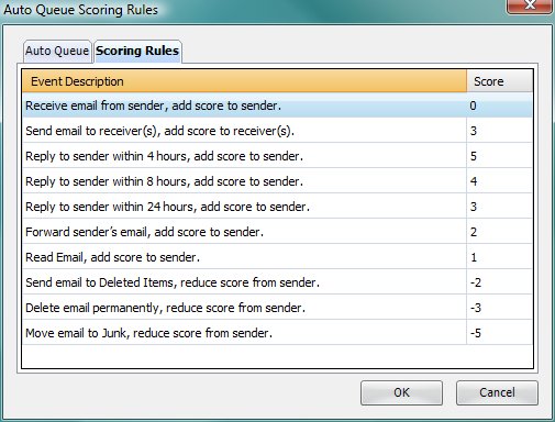 Auto-Queue is based on the user access habit such as view, reply, delete and forward an email. EasyLinkMail assigns scores to a sender address whenever you perform an action to an email. For example, view, reply and forward accumulates positive scores while delete or leaving an email unread for a long time generates negative scored. This weighing method results in collecting a group of important emails based on score values. The higher the score is, the more important the emails are from that particular sender.