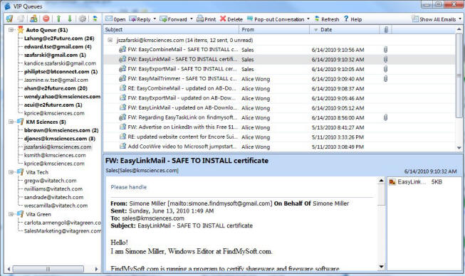 To access the VIP Queues from the EasyLinkMail drop menu select "Show VIP Queues". There are two types of VIP Queues: Auto-Queue and Custom Queue. Auto-Queues are created and maintained automatically by EasyLinkMail. The VIP Emails shows the result of ALL Queues based on the Queue setup and is in chronological order of arrival.