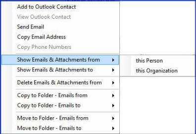 If you select this group, the system will display all emails "From" this person, not bi-directional exchanges. If you wish to see the emails you sent to this person, you should select "Show Emails and Attachments to -> this person".